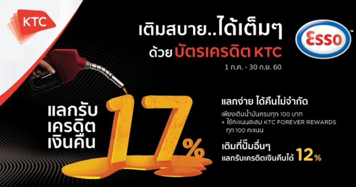 เติมสบาย.. ได้เต็มๆ ด้วยบัตรเครดิต KTC แลกรับเครดิตเงินคืนสูงสุด 17% ที่ปั๊มน้ำมัน ESSO เพียงเติมน้ำมันครบทุก 100 บาท พร้อมใช้คะแนนสะสม KTC Forever Rewards ทุก 100 คะแนน หรือรับเครดิตเงินคืน 12% เมื่อเติมที่ปั๊มอื่นๆ