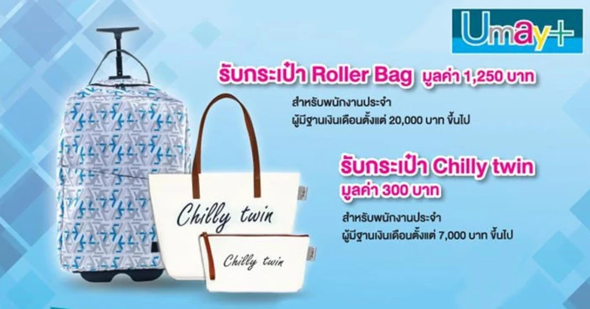 พบกับสิทธิพิเศษหลากหลาย จากบัตรกดเงินสดยูเมะพลัส เพียงสมัครบัตรกดเงินสดยูเมะพลัส ตั้งแต่วันนี้ - 31 สิงหาคม 2560 และยื่นเอกสารการสมัครครบถ้วน รับฟรีทันที กระเป๋า Roller Bag มูลค่า 1,250 บาท สำหรับพนักงานประจำผู้มีฐานเงินเดือนตั้งแต่ 20,000 บาทขึ้นไป และกระเป๋า Chilly twin มูลค่า 300 บาท สำหรับพนักงานประจำผู้มีฐานเงินเดือนตั้งแต่ 7,000 - 19,999 บาท พิเศษ!! อนุมัติปั๊บ รับเพิ่ม กระเป๋าเดินทางล้อลาก Todd ขนาด 20 นิ้ว มูลค่า 4,450 บาท เพียงมียอดเบิกถอนเงินสดในวันแรกตั้งแต่ 15,000 บาทขึ้นไป และมียอดเงินต้นคงค้างไม่ต่ำกว่า 10,000 บาท ติดต่อกันอย่างน้อย 30 วัน