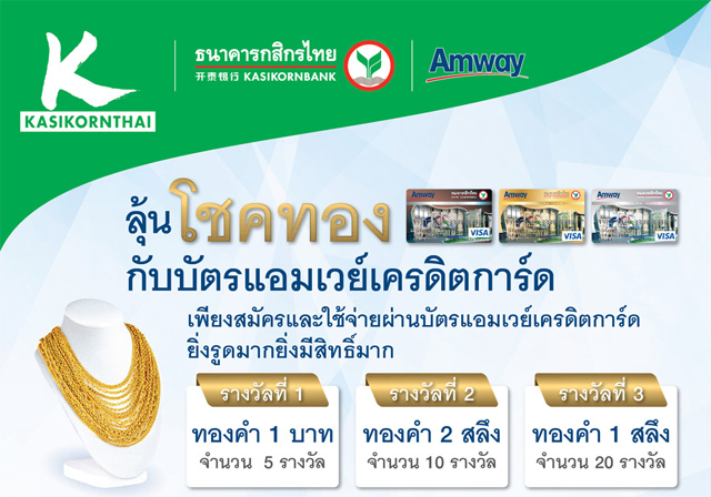 ลุ้นโชคทอง กับบัตรแอมเวย์เครดิตการ์ด เพียงสมัครและใช้จ่ายผ่านบัตรเครดิตฯ ยิ่งรูดมาก ยิ่งมีสิทธิ์มาก
