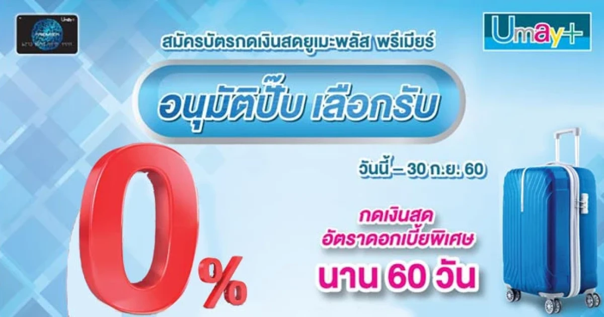 พบกับสิทธิพิเศษหลากหลาย จากบัตรยูเมะพลัส พรีเมียร์ เพียงสมัครบัตรยูเมะพลัส พรีเมียร์ ตั้งแต่วันนี้ - 30 กันยายน 2560 และทำรายการเบิกถอนเงินสดภายใน 30 วัน หลังได้รับการอนุมัติ เลือกรับไปเลยทันที ไม่ว่าจะเป็น อัตราดอกเบี้ยพิเศษ 0% นานถึง 60 วัน ที่จะช่วยให้คุณแบ่งเบาภาระค่าใช้จ่าย สำหรับยอดเบิกถอนเงินสดทุกรายการในวันแรกเท่านั้น หรือเลือกรับไปเลย กระเป๋าเดินทางล้อลาก Todd ขนาด 20 นิ้ว มูลค่า 4,450 บาท เพียงมียอดเบิกถอนเงินสดในวันแรกตั้งแต่ 15,000 บาทขึ้นไป และมียอดเงินต้นคงค้างไม่ต่ำกว่า 10,000 บาท ติดต่อกันอย่างน้อย 30 วัน