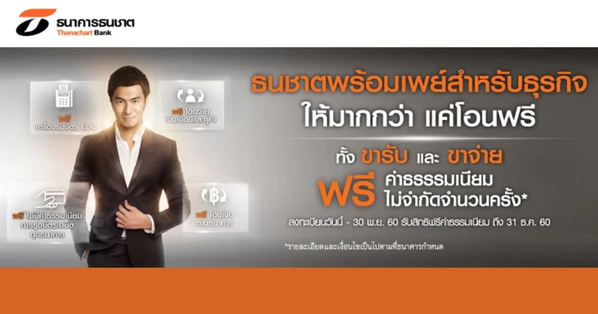 ลงทะเบียนธนชาตพร้อมเพย์สำหรับธุรกิจ วันนี้ - 30 พฤศจิกายน 2560 รับสิทธิ์ฟรีค่าธรรมเนียม ไม่จำกัดจำนวนครั้ง ถึง 31 ธันวาคม 2560