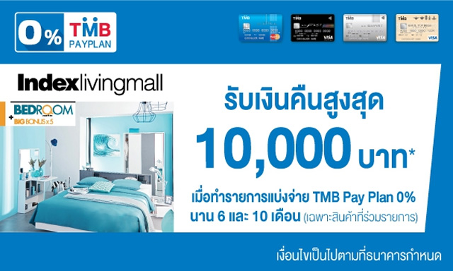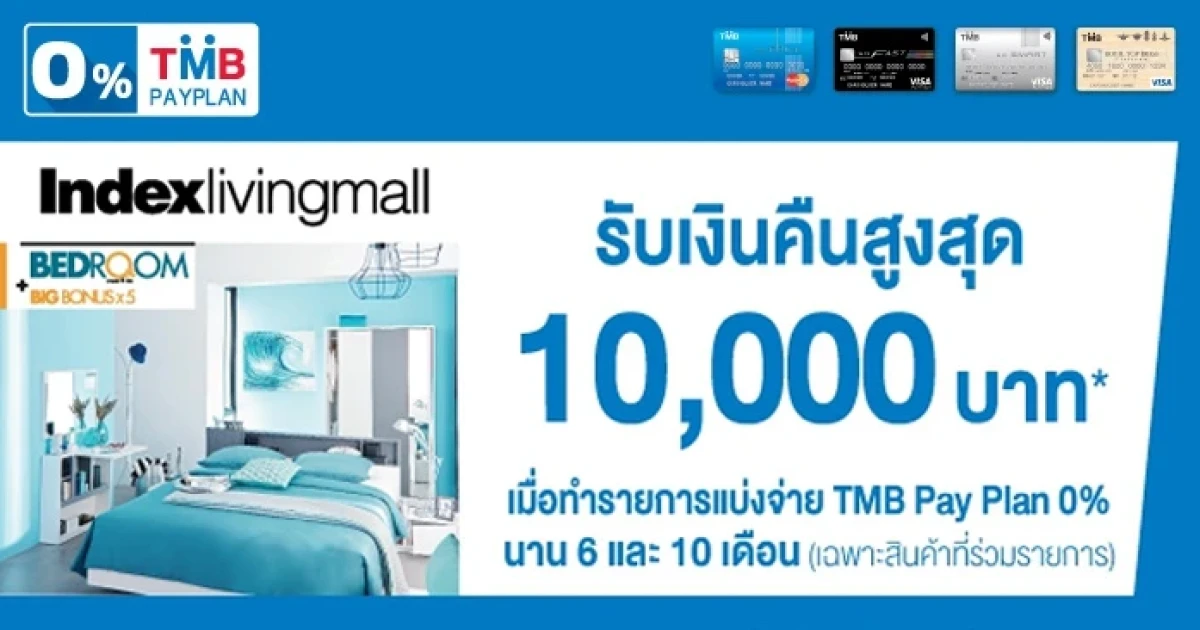 รับเงินคืนสูงสุด 10,000 บาท เมื่อทำรายการแบ่งจ่าย TMB Pay Plan 0% นาน 6 และ 10 เดือน (เฉพาะสินค้าที่ร่วมรายการ) ที่ Index Living Mall ทุกสาขา ผ่านบัตรเครดิต TMB