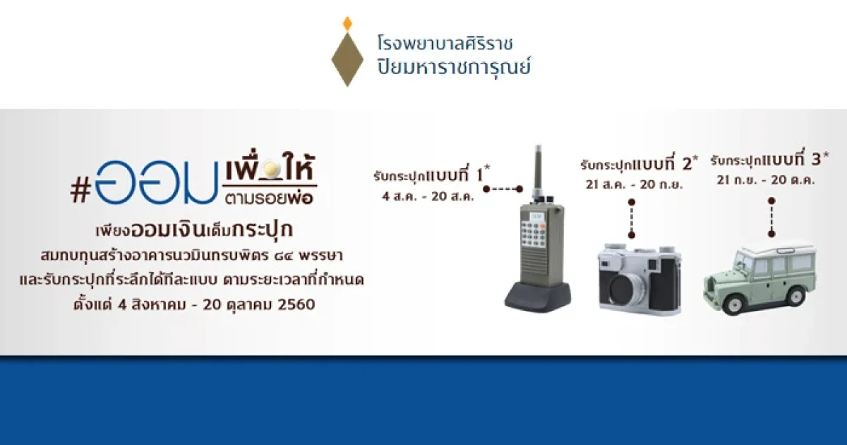 สมทบทุนสร้างอาคารนวมินทรบพิตร 84 พรรษา พร้อมรับกระปุกออมสินที่ระลึก 3 แบบ (ครั้งละ 1 แบบ) กับโรงพยาบาลศิริราช ปิยมหาราชการุณย์ ตั้งแต่วันที่ 4 สิงหาคม - 20 ตุลาคม 2560