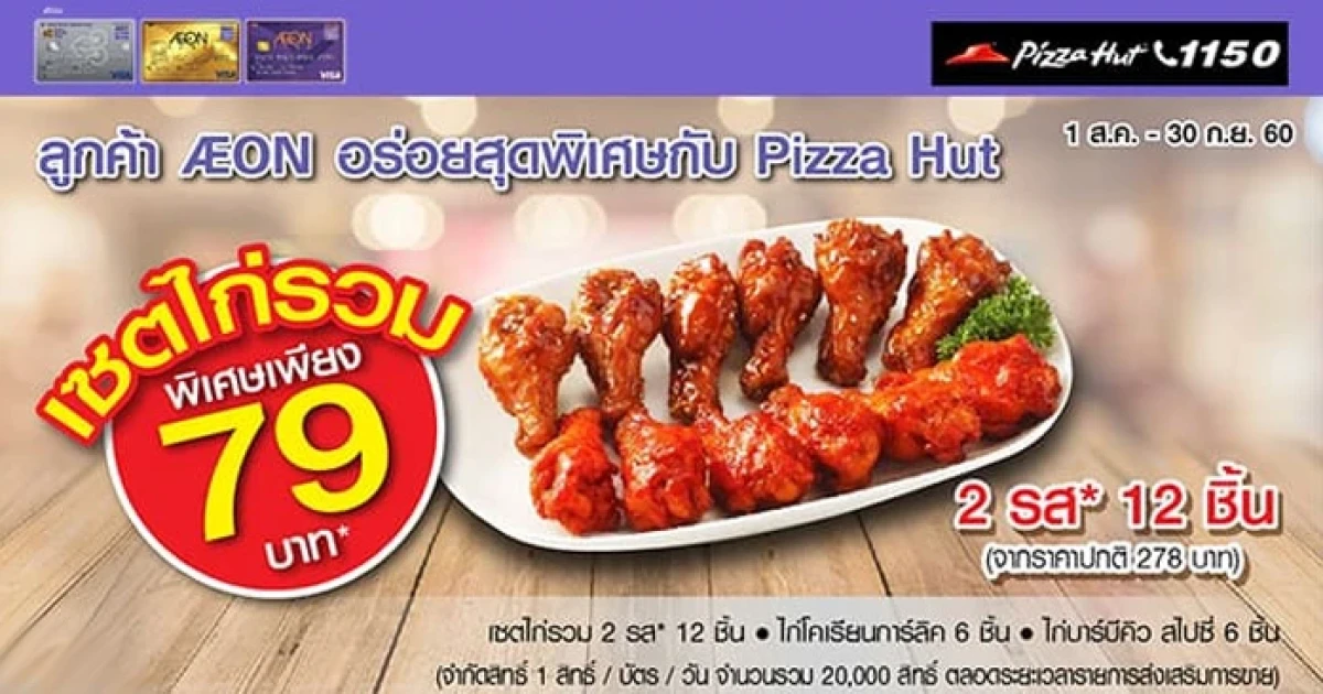 ลูกค้า AEON อร่อยสุดพิเศษกับ Pizza Hut.. รับสิทธิ์ซื้อเซตไก่รวม 2 รส ในราคา 79 บาท จากราคาปกติ 278 บาท ที่ร้าน Pizza Hut ทุกสาขาที่ร่วมรายการ และชำระผ่านบัตรเครดิตอิออน