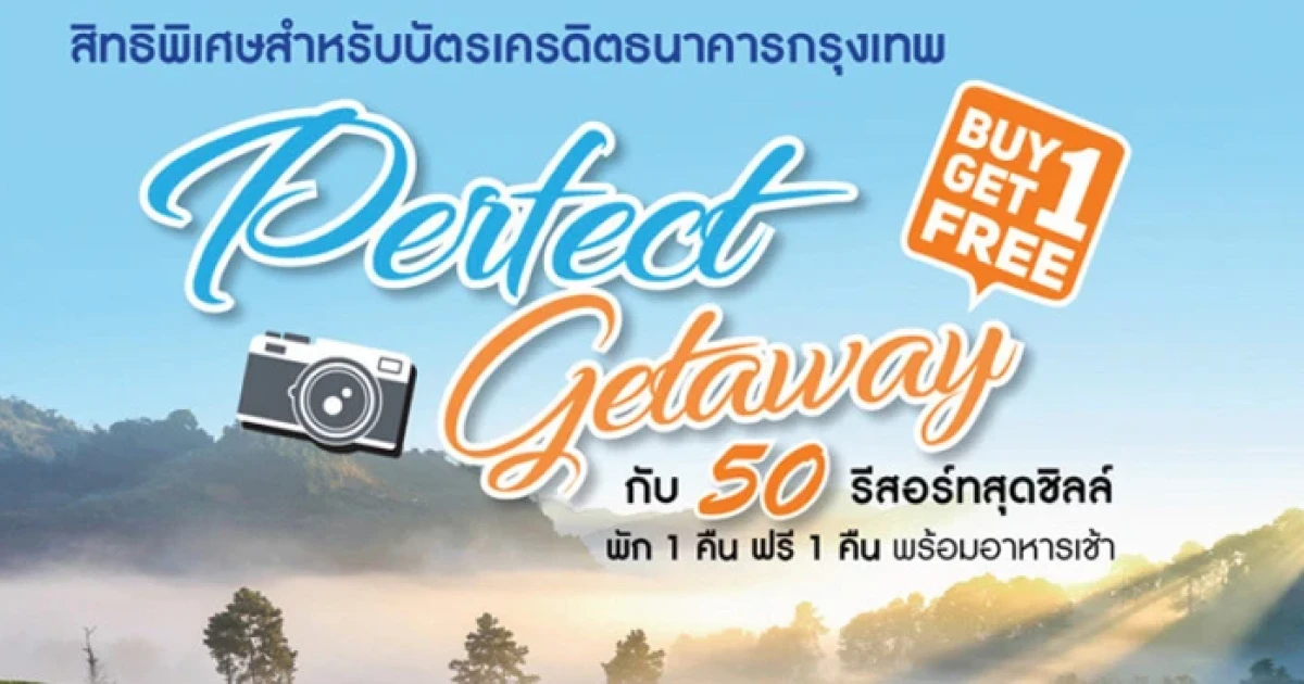 พัก 1 คืน ฟรี 1 คืน พร้อมอาหารเช้า สำหรับ 2 ท่าน กับ 50 รีสอร์ทสุดชิลล์ ที่ร่วมรายการ สิทธิพิเศษเมื่อชำระผ่านบัตรเครดิตธนาคารกรุงเทพ