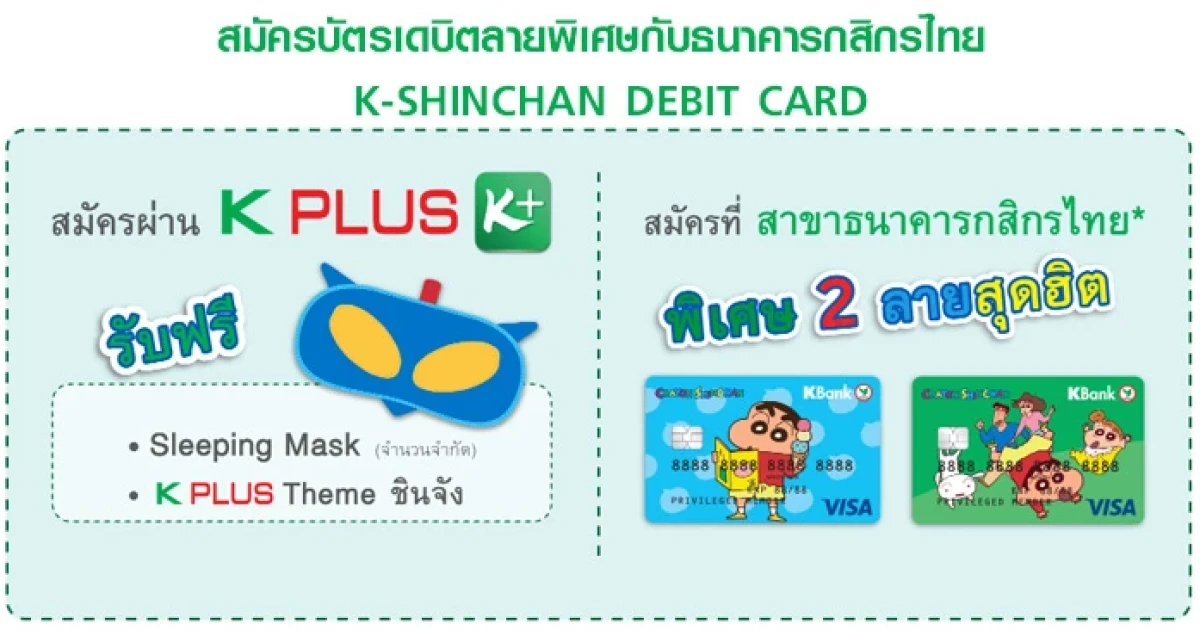 สมัครบัตรเดบิตลายพิเศษชินจังผ่าน K PLUS รับฟรี Sleeping Mask เลือกรับ 2 ลายพิเศษเมื่อสมัครที่สาขา