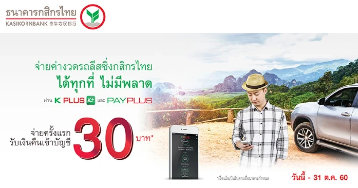 รับเงินคืนเข้าบัญชี 30 บาท เมื่อจ่ายค่างวดรถลีสซิ่งกสิกรไทย ผ่าน K PLUS หรือ Pay PLUS เป็นครั้งแรก