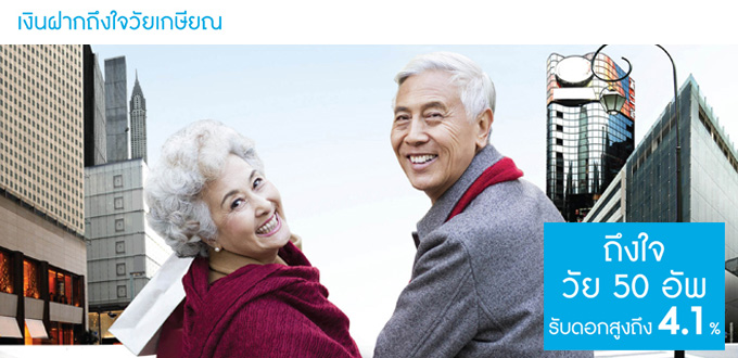 - ฝากขั้นต่ำ 100,000 บาท เฉพาะบุคคลธรรมดาอายุ 50 ปีขึ้นไปเท่านั้น