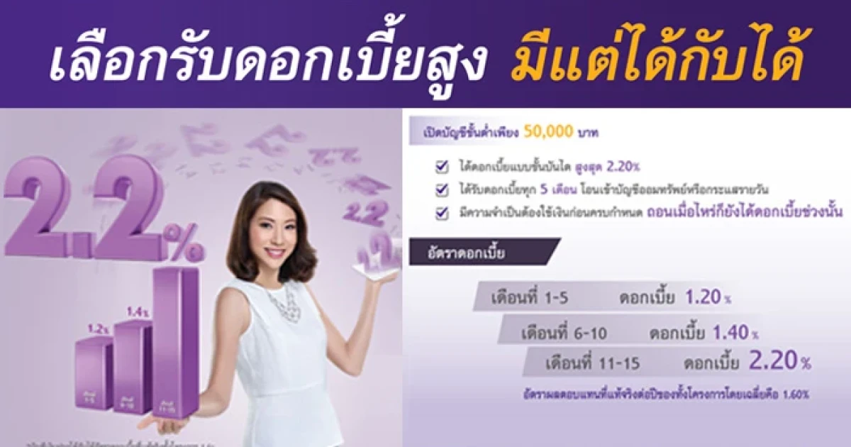 บัญชีเงินฝากประจำได้กับได้ (15 เดือน) จาก ธ.ไทยพาณิชย์ ให้ดอกเบี้ยแบบขั้นบันได สูงสุด 2.20% ต่อปี จ่ายดอกเบี้ยทุก 5 เดือน โดยโอนเข้าบัญชีออมทรัพย์หรือกระแสรายวัน หากจำเป็นต้องใช้เงินก็สามารถถอนได้โดยยังได้ดอกเบี้ยช่วงนั้น