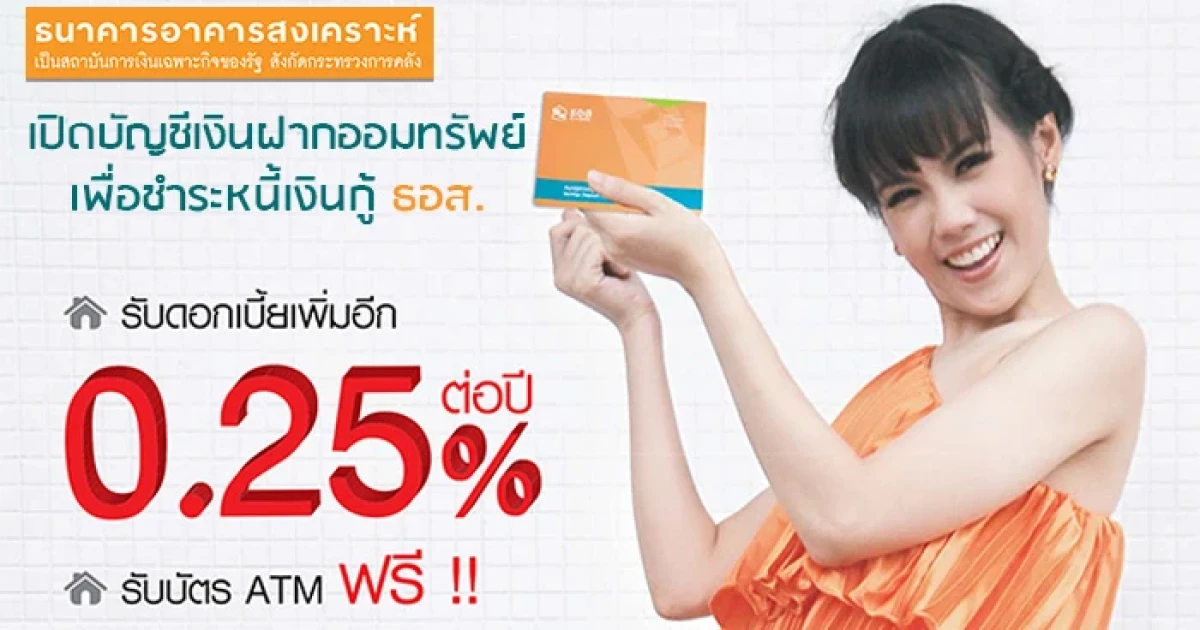 บัญชีเงินฝากออมทรัพย์ เพื่อหักชำระหนี้เงินกู้ ธอส. วันนี้ รับฟรี! บัตร ATM มอบดอกเบี้ยเพิ่มอีก 0.75% ต่อปี จากอัตราดอกเบี้ยเงินฝากออมทรัพย์ปกติ ฟรี! บัตร ATM พร้อมได้รับการยกเว้นค่าธรรมเนียมออกบัตร และค่าธรรมเนียมรายปีเฉพาะปีแรก