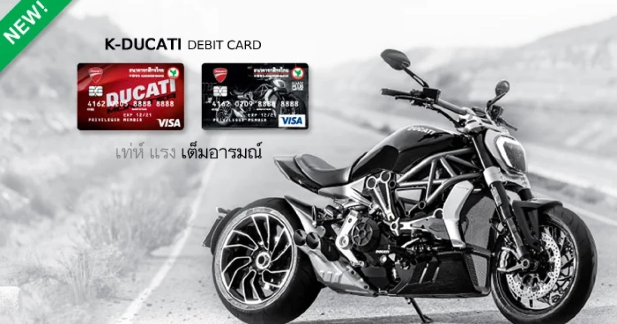 เหมาะสำหรับ : ผู้ที่ชื่นชอบรถจักรยานยนต์ยี่ห้อ DUCATI และมีบัญชีเงินฝากออมทรัพย์หรือกระแสรายวัน กับธนาคารกสิกรไทย