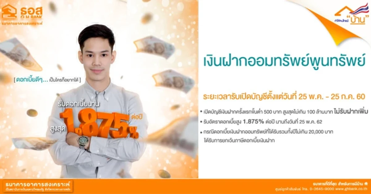 ผลิตภัณฑ์ใหม่เพื่อเป็นทางเลือกให้แก่ผู้รักการออมจากธนาคารอาคารสงเคราะห์ "เงินฝากออมทรัพย์พูนทรัพย์" รับดอกเบี้ยสูงถึง 1.875% ต่อปี