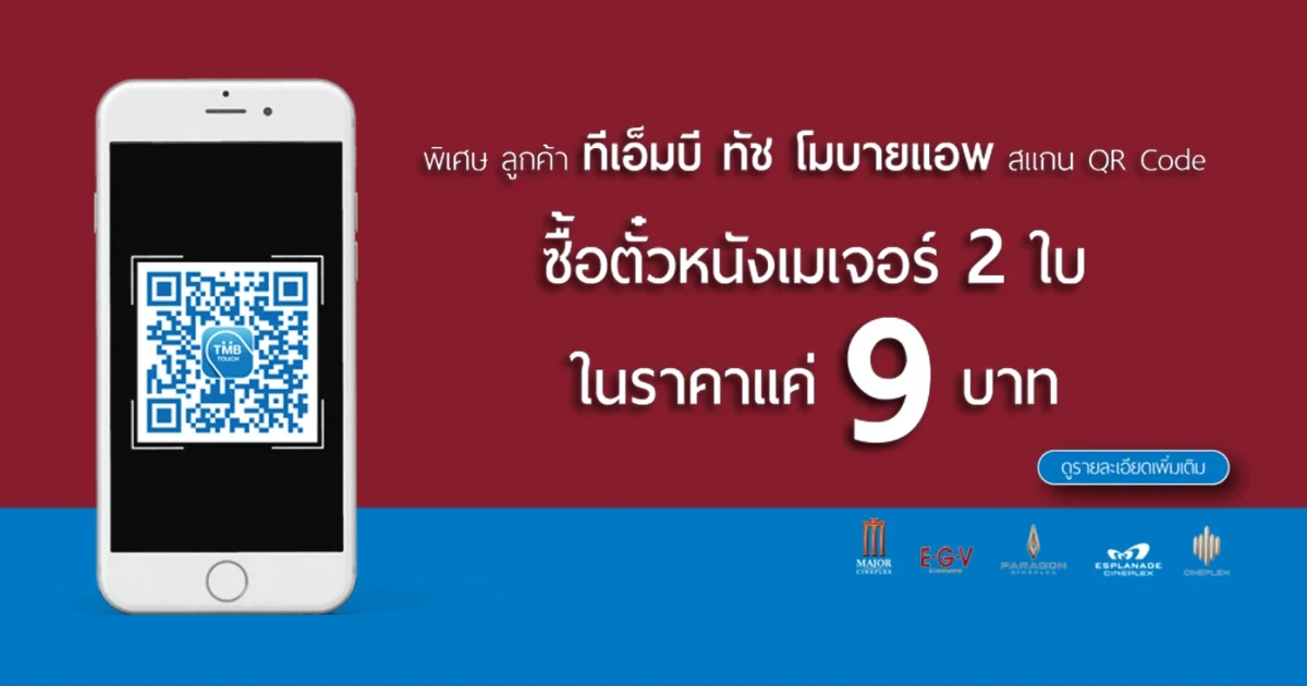 ลูกค้าทีเอ็มบี ทัช โมบายแอพ ซื้อตั๋วหนัง 2 ที่นั่ง ในราคาพิเศษ 9 บาท เมื่อชำระค่าตั๋วผ่านการสแกน QR Code ณ จุดจำหน่ายบัตรชมภาพยนตร์เมเจอร์ (Box Office) และสำหรับลูกค้าใหม่ที่เปิดบัญชี ทีเอ็มบี ออลล์ ฟรี พร้อมเปิดใช้งาน ทีเอ็มบี ทัช โมบายแอพ ภายในวันเดียวกัน รับฟรีตั๋วหนัง 1 ที่นั่ง สมัครเลยที่ TMB ทุกสาขา