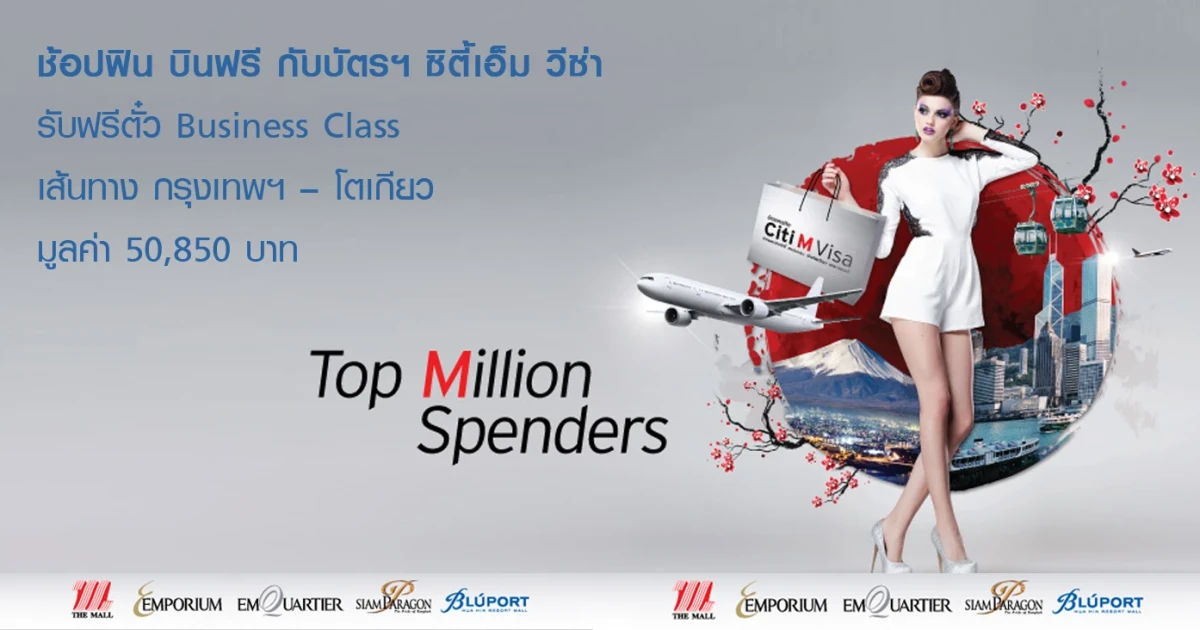 Top Million Spenders ช้อปฟิน บินฟรี กับบัตรเครดิตซิตี้เอ็ม วีซ่า รับฟรีตั๋ว Business Class เส้นทางกรุงเทพฯ - โตเกียว มูลค่า 50,850 บาท เมื่อมียอดใช้จ่ายภายในห้างฯ และศูนย์การค้าฯ ที่ร่วมรายการ ตั้งแต่ 1,200,000 บาทขึ้นไป/ เดือน