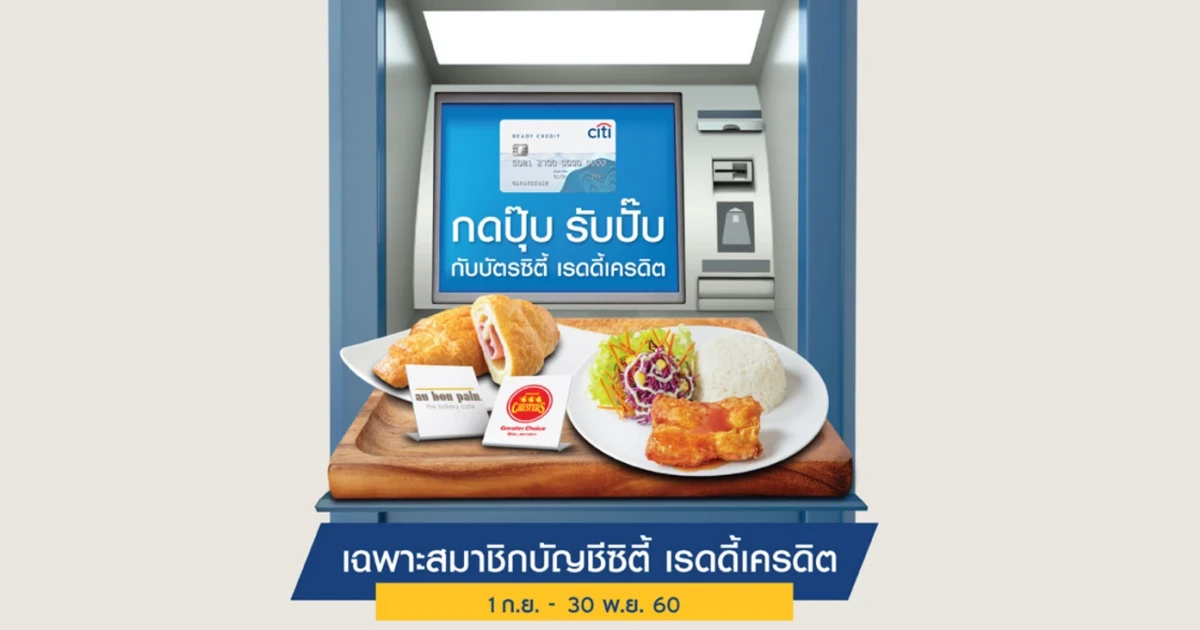 เงื่อนไขธนาคารซิตี้แบงก์ : สมาชิกบัญชีซิตี้ เรดดี้เครดิต รับฟรี ครัวซองค์แฮมชีส 1 ชิ้น มูลค่า 80 บาท จาก au bon pain หรือจ่ายเพียง 1 บาท รับข้าวไก่กรอบซอสน้ำปลา 1 จาน มูลค่า 75 บาท จาก Chester's