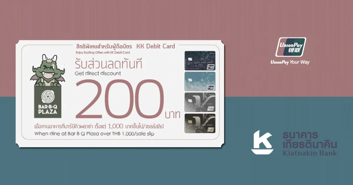 สิทธิพิเศษสำหรับผู้ถือบัตร KK Debit Card UnionPay รับส่วนลดทันที 200 บาท เมื่อทานอาหารที่บาร์บีคิว พลาซ่า ตั้งแต่ 1,000 บาทขึ้นไป/เซลล์สลิป