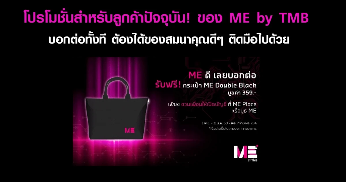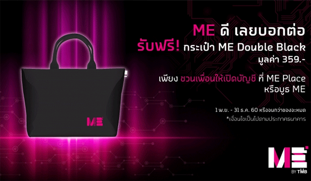 โปรโมชั่นสำหรับลูกค้าปัจจุบัน! บอกต่อทั้งที ต้องได้ของสมนาคุณดีๆ ติดมือไปด้วย เพียงคุณแนะนำเพื่อน มาเปิดบัญชีที่ ME Place หรือ บูธ ME รับไปเลย "กระเป๋า ME Double Black" มูลค่า 359 บาท โดยคุณจะมาพร้อมกับเพื่อน เพื่อรับของสมนาคุณกลับไปเอง หรือให้เพื่อนที่มาเปิดบัญชีเป็นผู้รับกลับแทนก็ให้ได้