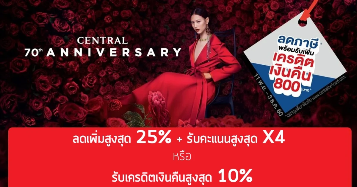 ลดเพิ่มสูงสุด 25% หรือเงินคืนสูงสุด 10% ที่เซ็นทรัลทุกสาขาและเซน จากบัตรเครดิตเซ็นทรัล เดอะวัน