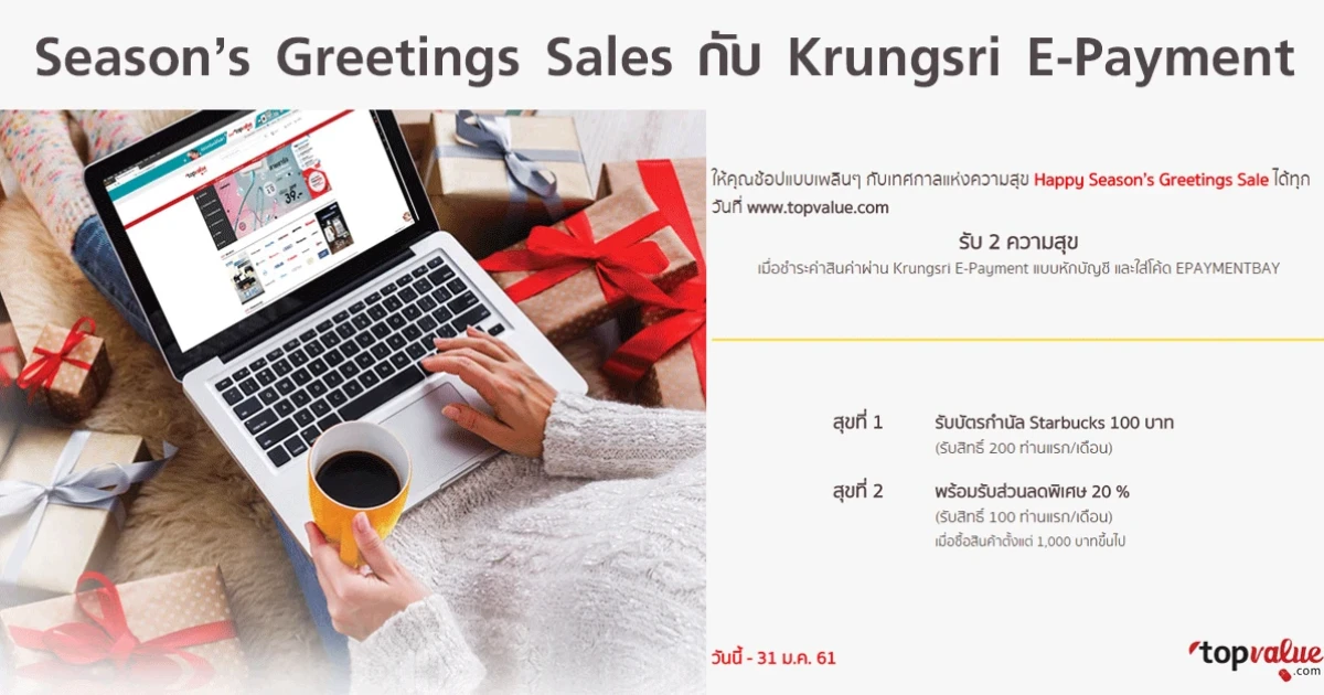 Season's Greetings Sale กับ Krungsri E-Payment ให้คุณช้อปแบบเพลินๆ กับเทศกาลแห่งความสุข Happy Season's Greetings Sale ได้ทุกวันที่ www.topvalue.com