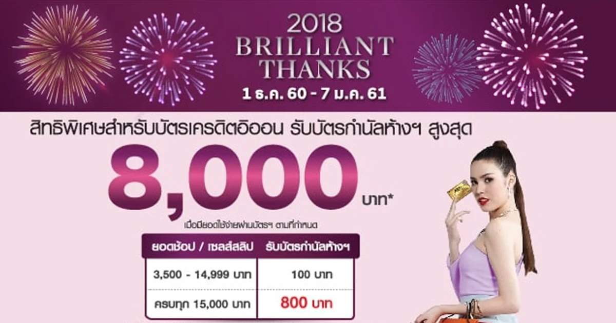2018 Brilliant Thanks รับบัตรกำนัลห้างฯ สูงสุด 8,000 บาท เมื่อช้อปที่ห้างฯ ที่ร่วมรายการ ผ่านบัตรฯ อิออน