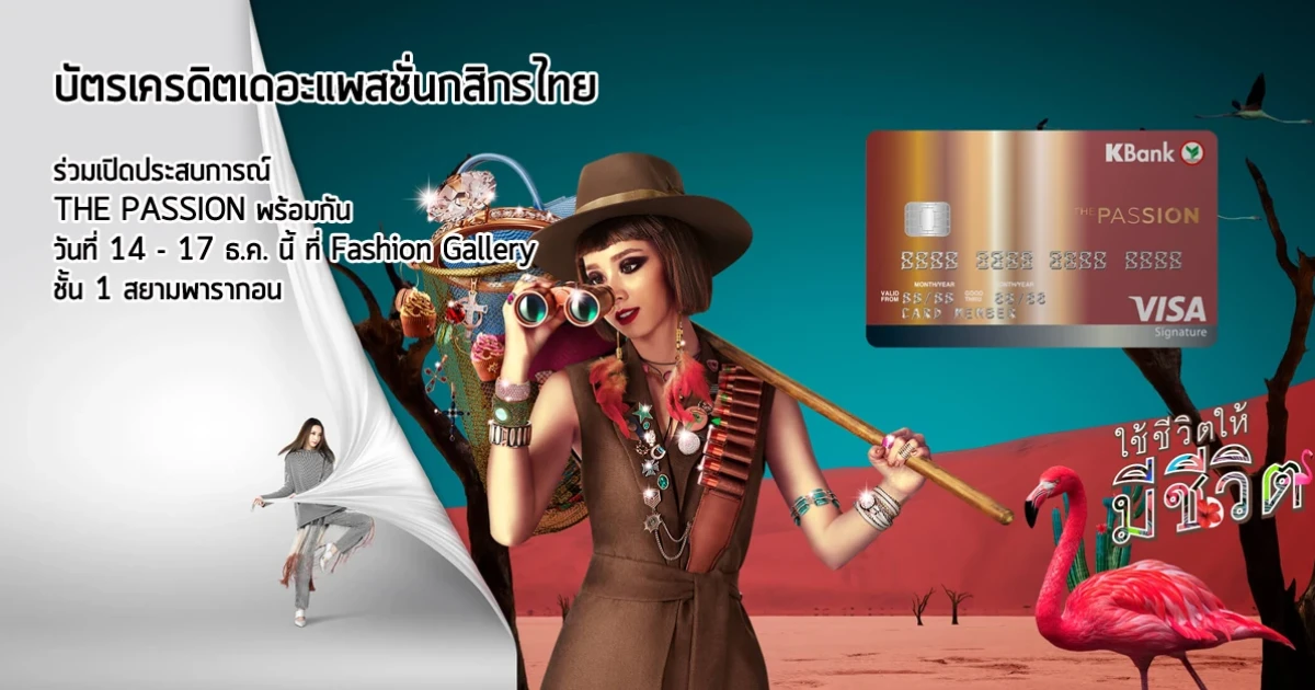บัตรเครดิต The Passion กสิกรไทย พร้อมมั้ย... ที่จะมาเปลี่ยนชีวิตให้มี ชีวิตชีวา ร่วมเปิดโลก THE PASSION พร้อมกัน ในวันที่ 14 - 17 ธ.ค. นี้ ที่ชั้น 1 Fashion Gallery สยามพารากอน มาร่วมกิจกรรมสนุกๆ ชิงรางวัลตั๋วเครื่องบินไป-กลับ กรุงเทพฯ - ญี่ปุ่น จำนวน 2 รางวัล (รางวัลละ 2 ที่นั่ง) มูลค่ากว่า 60,000 บาท