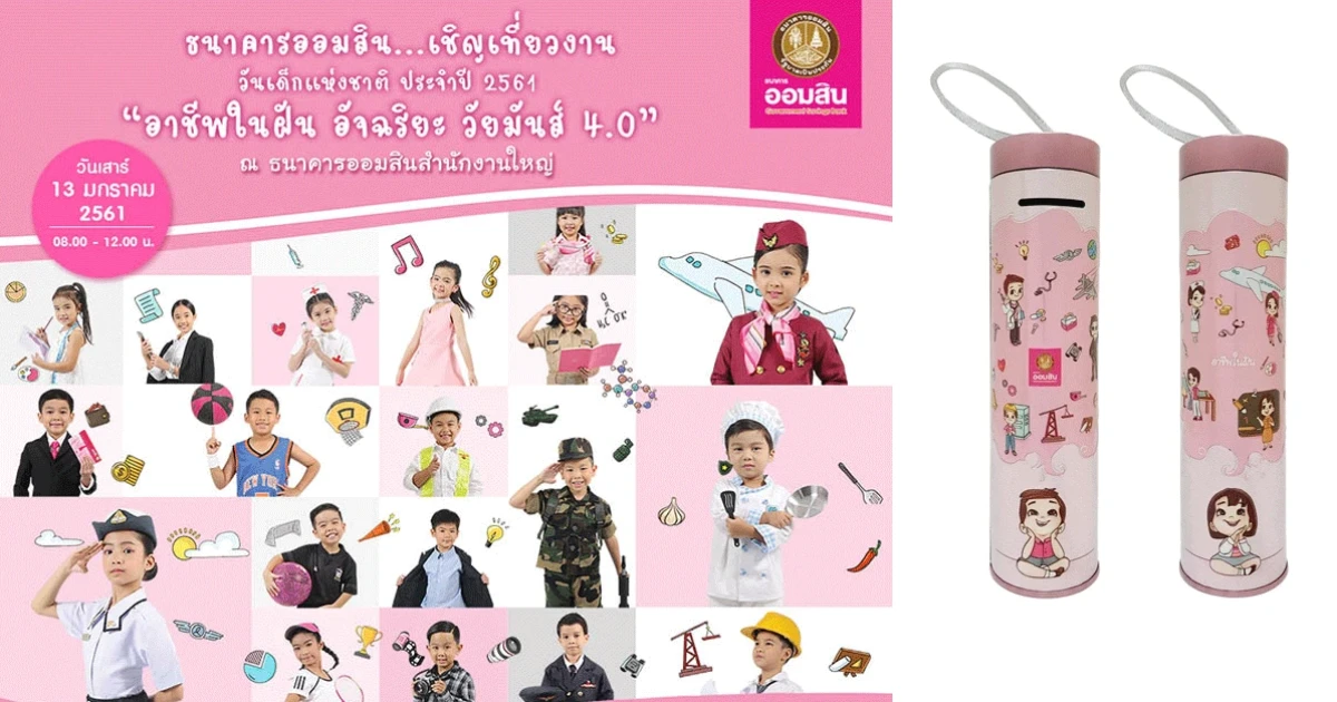 ธนาคารออมสิน จัดกิจกรรม "วันเด็กแห่งชาติ" ประจำปี 2561 ณ ธนาคารออมสินสำนักงานใหญ่ สำนักงานภาค และสาขาทั่วประเทศ ภายใต้แนวคิด "อาชีพในฝัน อัจฉริยะ วัยมันส์ 4.0" พร้อมเปิดทุกสาขาทั่วประเทศให้เด็กฝากเงินเป็นกรณีพิเศษ ตั้งแต่ 8.30 - 11.00 น. ฝากเงินหรือเปิดบัญชีด้วยตัวเอง ตั้งแต่ 100 บาทขึ้นไป รับของที่ระลึกฟรี! "กระปุกออมสินอาชีพในฝัน"