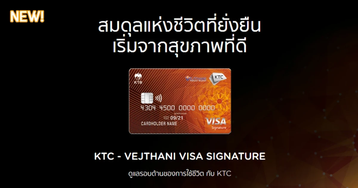 หลังจากเพิ่งเปิดตัว บัตรเครดิต KTC - REV PLATINUM ไปหมาดๆ ล่าสุด บริษัท บัตรกรุงไทย หรือ KTC ก็ออก บัตรเครดิตใบใหม่ตามมาติดๆ ค่ะ นั่นก็คือ "บัตรเครดิต KTC - VEJTHANI VISA SIGNATURE" ที่จะมาช่วยทำให้เรื่องสุขภาพของเราเป็นเรื่องง่ายขึ้น เสริมสร้างสมดุลในการใช้ชีวิต เพื่อการมีสุขภาพที่ดีอย่างยั่งยืน และนอกจากนั้นยังให้สิทธิพิเศษในด้านอื่นๆ อีกมากมาย ลองไปดูรายละเอียดของบัตรเครดิตใบนี้พร้อมๆ กันเลยค่ะ