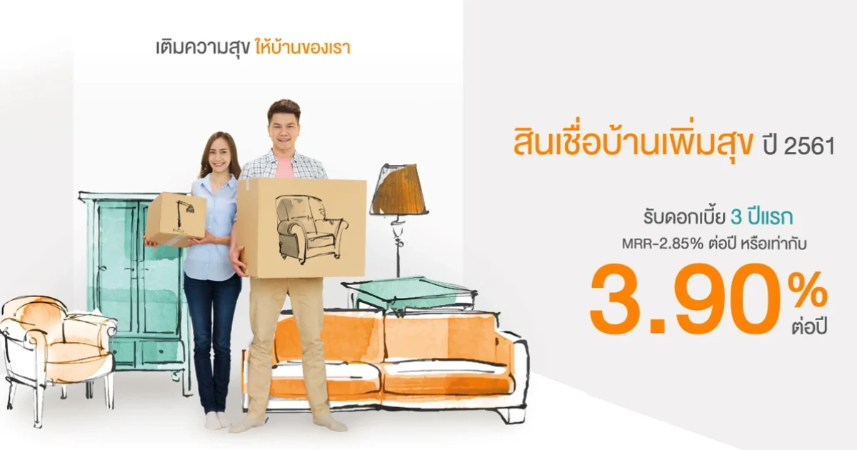 เติมความสุขให้บ้านของเรา สินเชื่อบ้านเพิ่มสุข ปี 2561 รับดอกเบี้ย 3 ปีแรก MRR-2.85% ต่อปี หรือเท่ากับ 3.90% ต่อปี