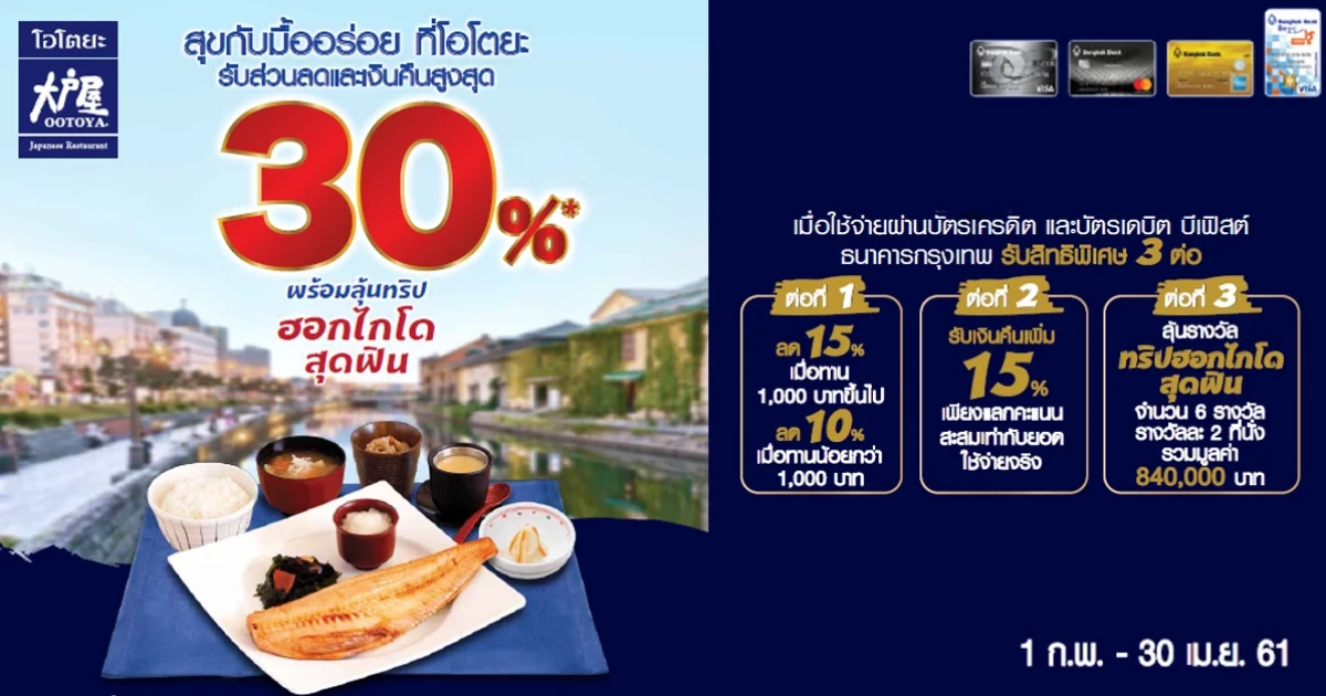 สุขกับมื้ออร่อย ที่โอโตยะ รับส่วนลดและเงินคืนสูงสุด 30% พร้อมลุ้นทริปฮอกไกโด สุดฟิน จากบัตรเครดิต และบัตรเดบิต ธนาคารกรุงเทพ