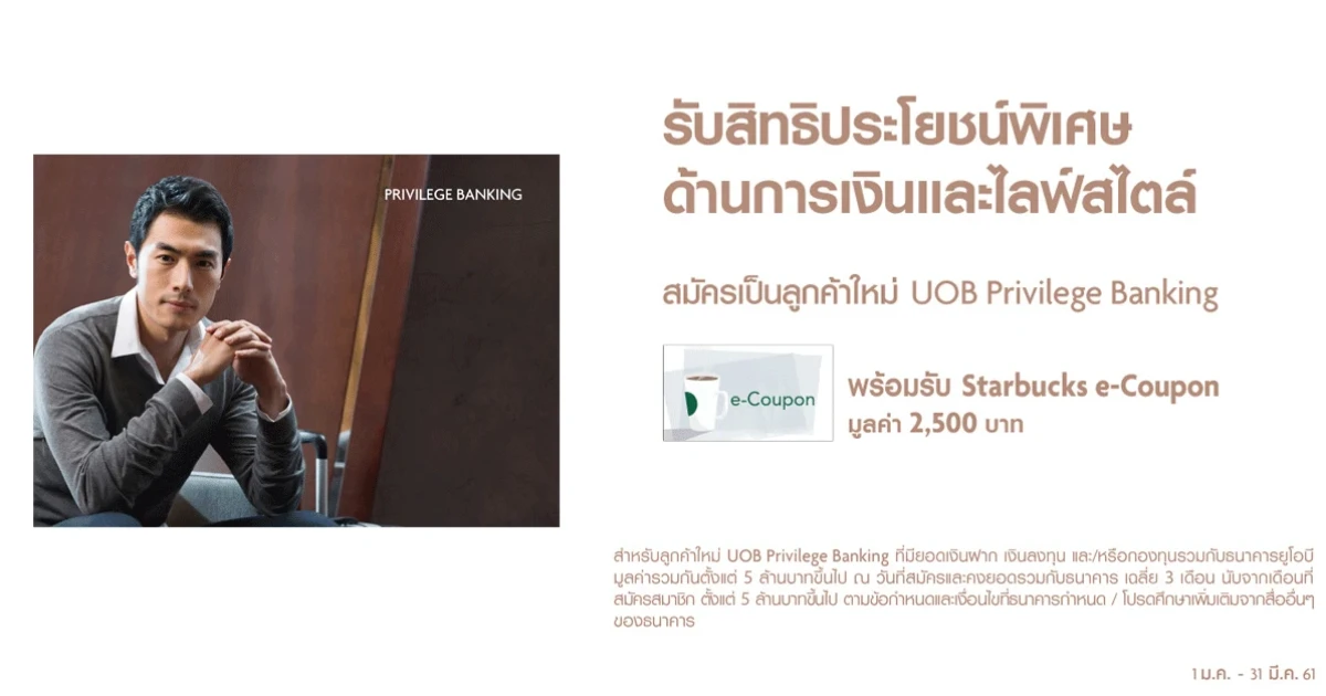 รับสิทธิประโยชน์พิเศษ ด้านการเงิน และไลฟ์สไตล์ สมัครเป็นลูกค้าใหม่ UOB Privilege Banking รับ Starbucks e-Coupon มูลค่า 2,500 บาท