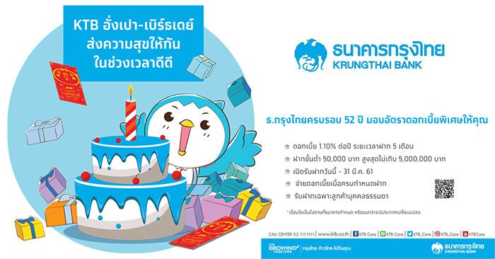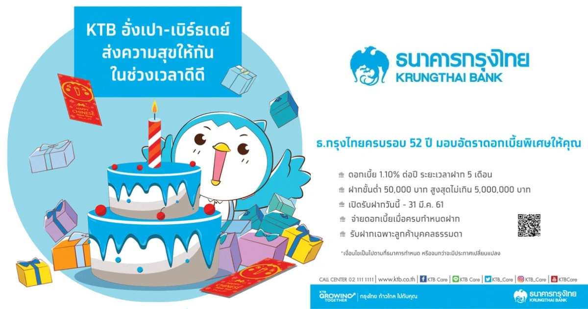 ธนาคารกรุงไทยครบรอบ 52 ปี มอบอัตราดอกเบี้ยพิเศษให้คุณ กับบัญชีเงินฝากประจำพิเศษ อั่งเปา-เบิร์ธเดย์ (ระยะเวลาฝาก 5 เดือน) สำหรับลูกค้าบุคคลธรรมดาสัญชาติไทยเท่านั้น
