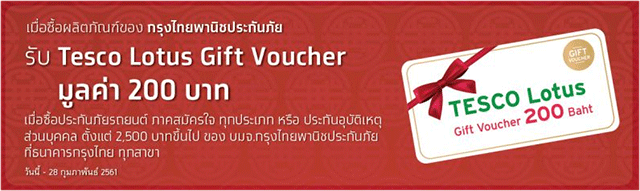 เมื่อซื้อผลิตภัณฑ์ของ กรุงไทยพานิชประกันภัย รับ Tesco Lotus Gift Voucher มูลค่า 200 บาท