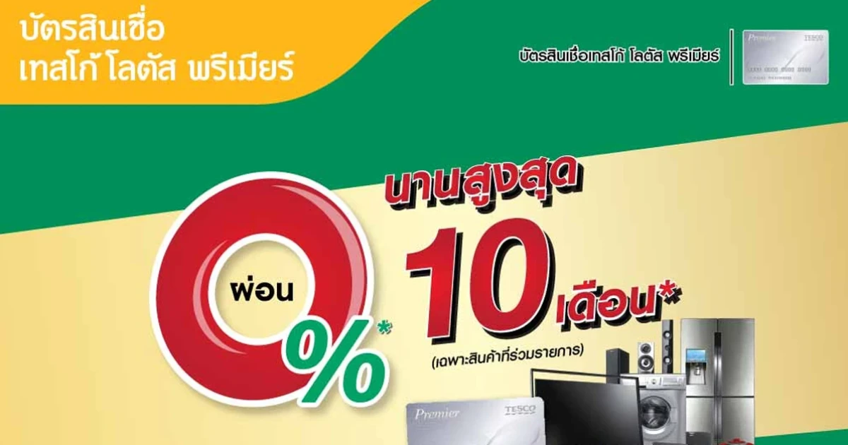 บัตรสินเชื่อเทสโก้ โลตัส พรีเมียร์ ผ่อน 0% นาน 10 เดือน เมื่อซื้อเครื่องใช้ไฟฟ้าหรือโทรศัพท์มือถือ