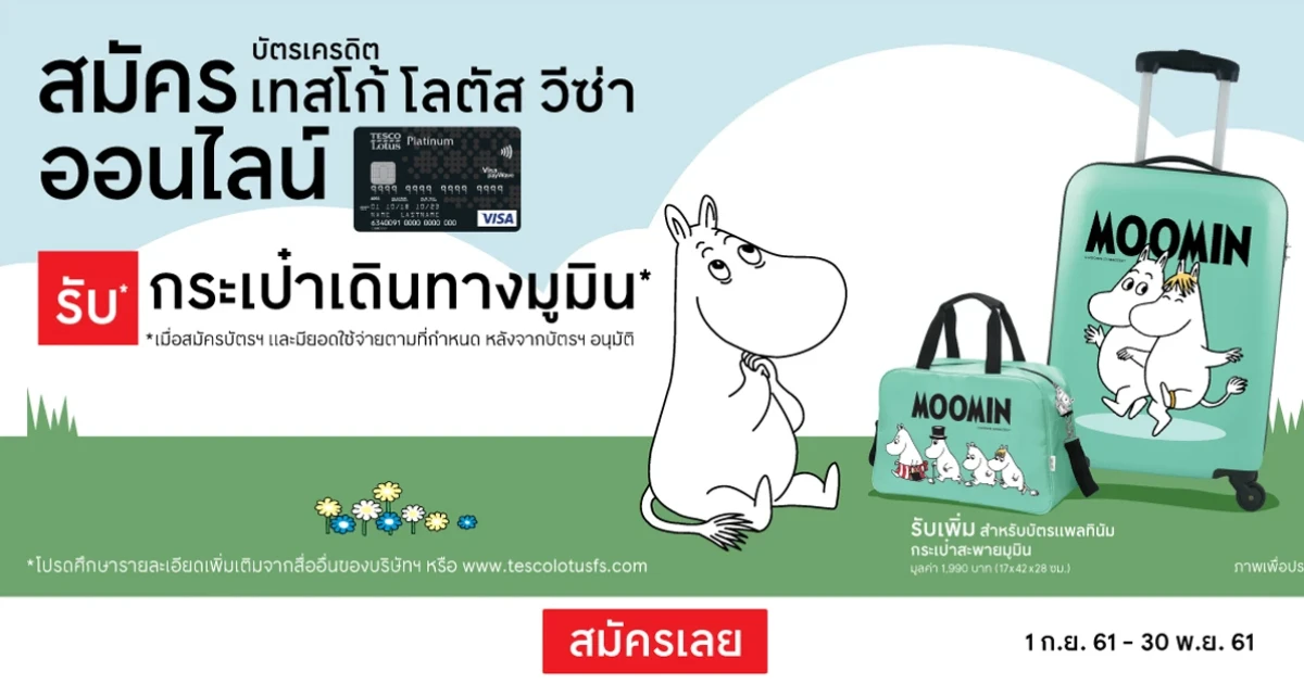 สมัครบัตรเครดิตเทสโก้ โลตัส วีซ่า ออนไลน์ วันนี้ รับกระเป๋าเดินทางมูมิน ขนาด 20 นิ้ว มูลค่ารวม 7,980 บาท