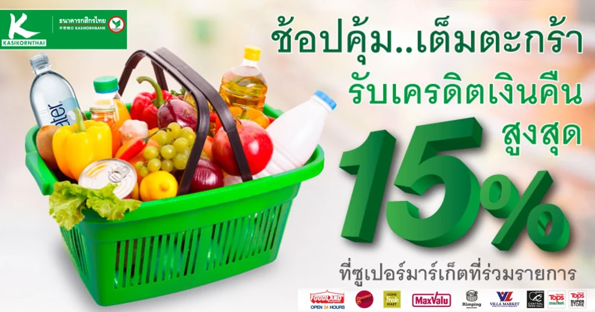 ช้อปคุ้ม.. เต็มตะกร้า รับเครดิตเงินคืนสูงสุด 15% ณ ซูเปอร์มาร์เก็ตที่ร่วมรายการ อาทิ Foodland, Gourmet Market, Home Fresh Mart, Maxvalu, Central Food Hall, Tops Market จากบัตรเครดิตกสิกรไทย