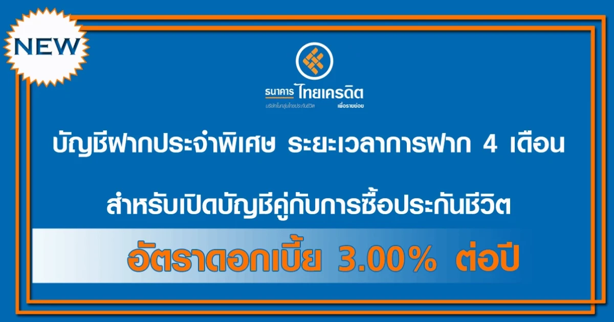 บัญชีฝากประจำพิเศษ ระยะเวลาการฝาก 4 เดือน สำหรับเปิดบัญชีคู่กับการซื้อประกันชีวิต - ธ.ไทยเครดิต