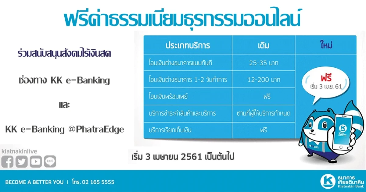 โดยธนาคารเกียรตินาคิน มีความยินดีที่จะ *ยกเว้นค่าธรรมเนียมการทำธุรกรรมทางการเงินทุกประเภทผ่านช่องทางออนไลน์ (Internet และ Mobile Banking) ผ่านทาง KK e-Banking และ KK e-Banking @PhatraEdge โดยเริ่มตั้งแต่วันที่ 3 เมษายน 2561 เป็นต้นไป ได้แก่