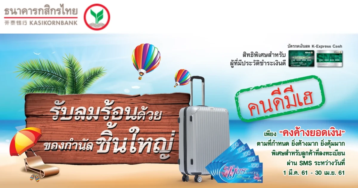 - ธนาคารขอสงวนสิทธิมอบของกำนัลที่มีมูลค่าสูงสุดเพียง 1 รางวัล กรณีที่ลูกค้าเข้าร่วมกิจกรรมส่งเสริมการขายมากกว่า 1 รายการขึ้นไป โดยมีรายละเอียดของกำนัลดังนี้ รับกระเป๋าล้อลาก 26 นิ้ว มูลค่า 5,990 บาท หรือบัตรกำนัล Tesco Lotus 800 บาท หรือ 400 บาท หรือ 100 บาท เมื่อมียอดคงค้างเพิ่มขึ้นตั้งแต่ 100,000 บาทขึ้นไป หรือตั้งแต่ 50,000 บาทขึ้นไป หรือตั้งแต่ 30,000 บาทขึ้นไป หรือตั้งแต่ 10,000 บาทขึ้นไป ตามลำดับจากใบแจ้งยอดบัญชีของเดือน ก.พ. 61 โดยมียอดคงค้างดังกล่าวระหว่าง 22 มี.ค. 61 ถึง 31 มี.ค. 61 และ ระหว่าง 21 เม.ย. 61 ถึง 30 เม.ย. 61 และได้ลงทะเบียนเข้าร่วมรายการผ่าน SMS ทางโทรศัพท์เคลื่อนที่เฉพาะ 2,200 รายแรกเท่านั้น โดยพิมพ์ KEC เว้นวรรค ตามด้วยหมายเลขบัตร K-Express Cash 12 หลักสุดท้าย ส่งมาที่ 4545888 (ครั้งละ 3 บาท) ตั้งแต่วันที่ 1 มี.ค. - 30 เม.ย. 61 และได้รับ SMS ยืนยันการเข้าร่วมรายการจากธนาคารหลังจากการลงทะเบียนแล้ว
