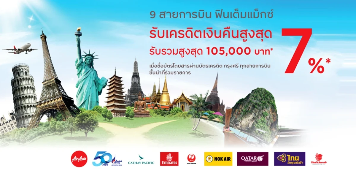 9 สายการบิน ฟินเต็มแม็กซ์ รับเครดิตเงินคืนสูงสุด 7% รับรวมสูงสุด 105,000 บาท เมื่อมียอดซื้อบัตรโดยสารผ่านบัตรเครดิตกรุงศรี ทุกสายการบินชั้นนำที่ร่วมรายการ