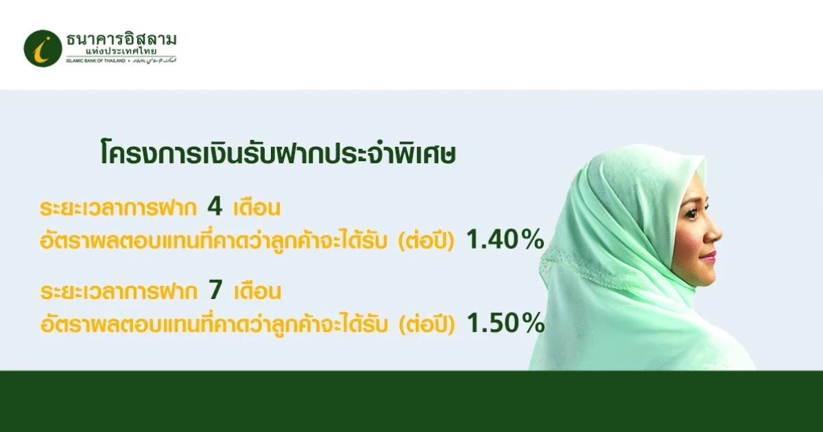 โครงการเงินรับฝากประจำพิเศษ จาก ธ.อิสลาม อัตราผลตอบแทนที่คาดว่าลูกค้าจะได้รับสูงสุด 1.50% ต่อปี