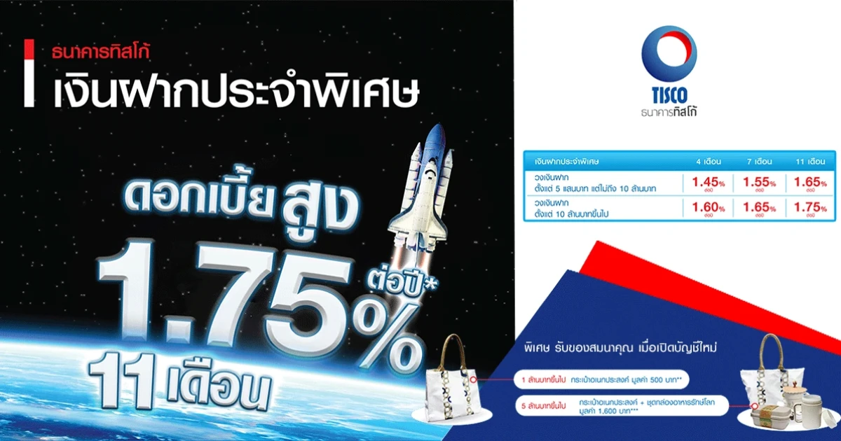 เงินฝากดอกเบี้ยสูง จาก ธ.ทิสโก้ ให้ดอกเบี้ยสูงสุด 1.75% ต่อปี พร้อมรับของสมนาคุณเมื่อเปิดบัญชีใหม่