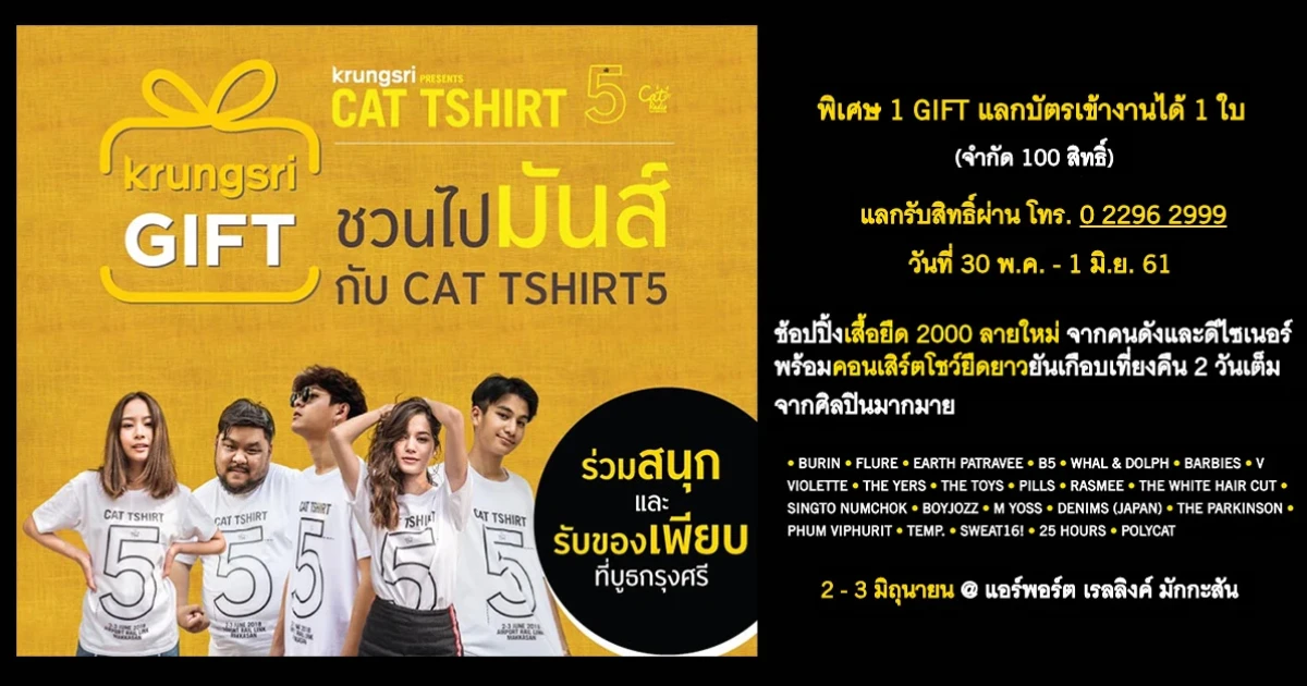 Krungsri GIFT ชวนไปมันส์ กับ CAT TSHIRT5 ช้อปปิ้งเสื้อยืด 2000 ลายใหม่ พร้อมคอนเสิร์ตโชว์ยืดยาว 2 วันเต็มจากศิลปินมากมาย วันที่ 2-3 มิถุนายน @ แอร์พอร์ต เรลลิงค์ มักกะสัน