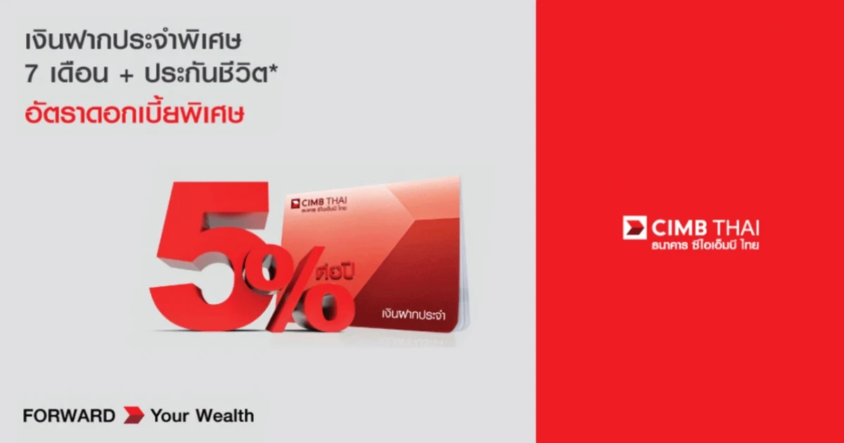 บัญชีเงินฝากประจำพิเศษ 7 เดือน+ประกันชีวิต* อัตราดอกเบี้ยพิเศษ 5.00% ต่อปี จาก ธ.ซีไอเอ็มบี ไทย
