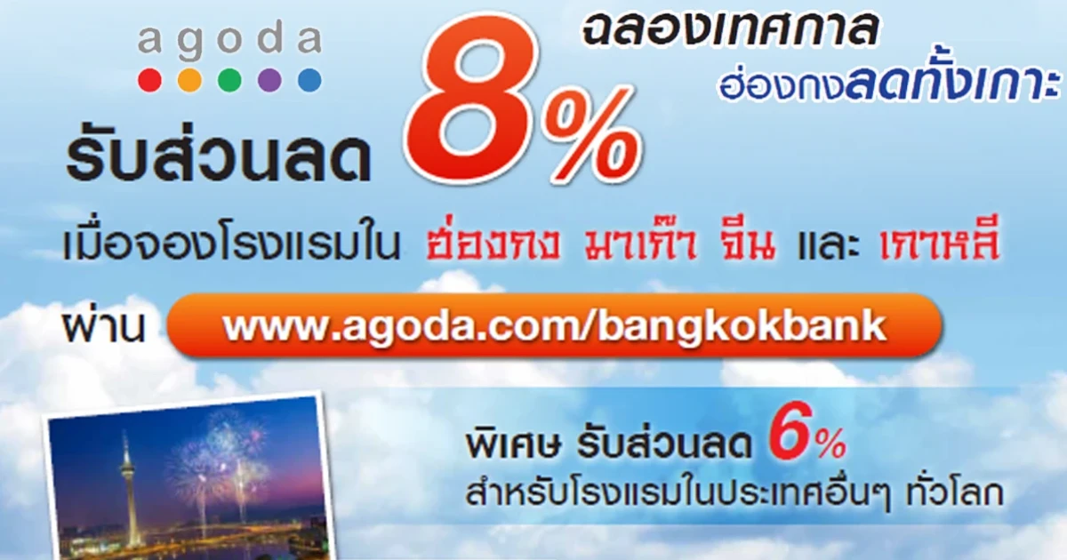 ฉลองเทศกาล ฮ่องกงลดทั้งเกาะ รับส่วนลดสูงสุด 8% เมื่อจองโรงแรมใน ฮ่องกง มาเก๊า จีน และเกาหลี ผ่าน www.agoda.com/bangkokbank ด้วยบัตรเครดิตธนาคารกรุงเทพ
