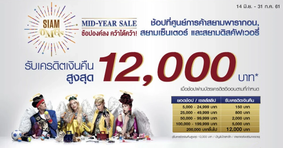 Siam OMGs Mid Year Sale 2018 รับเครดิตเงินคืนสูงสุด 12,000 บาท เมื่อช้อปที่ศูนย์การค้าสยามพารากอน สยามเซ็นเตอร์ และสยามดิสคัฟเวอรี่ (ยกเว้นห้างสรรพสินค้า) ผ่านบัตรเครดิตอิออน