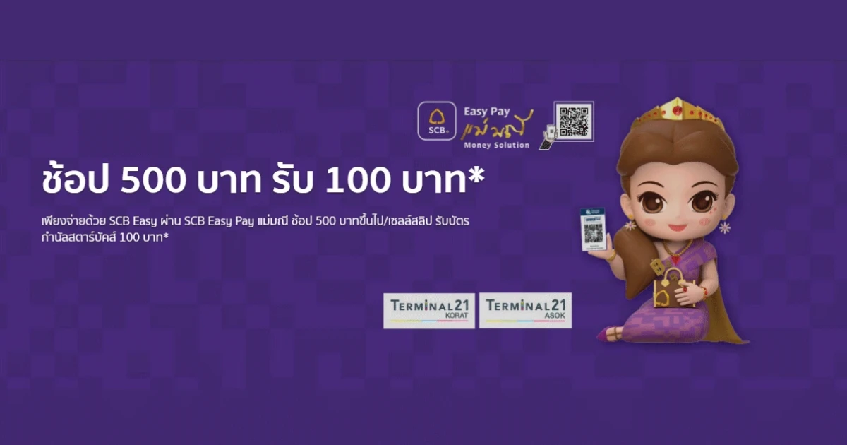 - ลูกค้ารับสิทธิ์เมื่อชำระค่าสินค้าและบริการ ด้วยการสแกน QR Code ผ่านแอปพลิเคชัน SCB EASY กับร้านค้าที่ร่วมรายการใน Terminal 21 อโศก และ Terminal 21 โคราช เท่านั้น