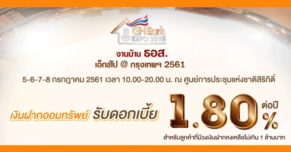 จองสิทธิ์เปิดบัญชีเงินฝากออมทรัพย์ดอกเบี้ยสูง รับดอกเบี้ยสูงสุดถึง 1.80% ต่อปี กับ ธนาคารอาคารสงเคราะห์ ในงานบ้าน ธอส. เอ็กซ์โป @กรุงเทพ 2561 วันที่ 5 - 8 กรกฎาคม 2561 เวลา 10.00 - 20.00 น. ณ ศูนย์การประชุมแห่งชาติสิริกิติ์