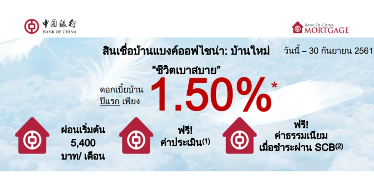 "ชีวิตเบาสบาย" ด้วยสินเชื่อบ้านแบงค์ออฟไชน่า ดอกเบี้ยปีแรกเพียง 1.50% ต่อปี พร้อมฟรีค่าธรรมเนียม
