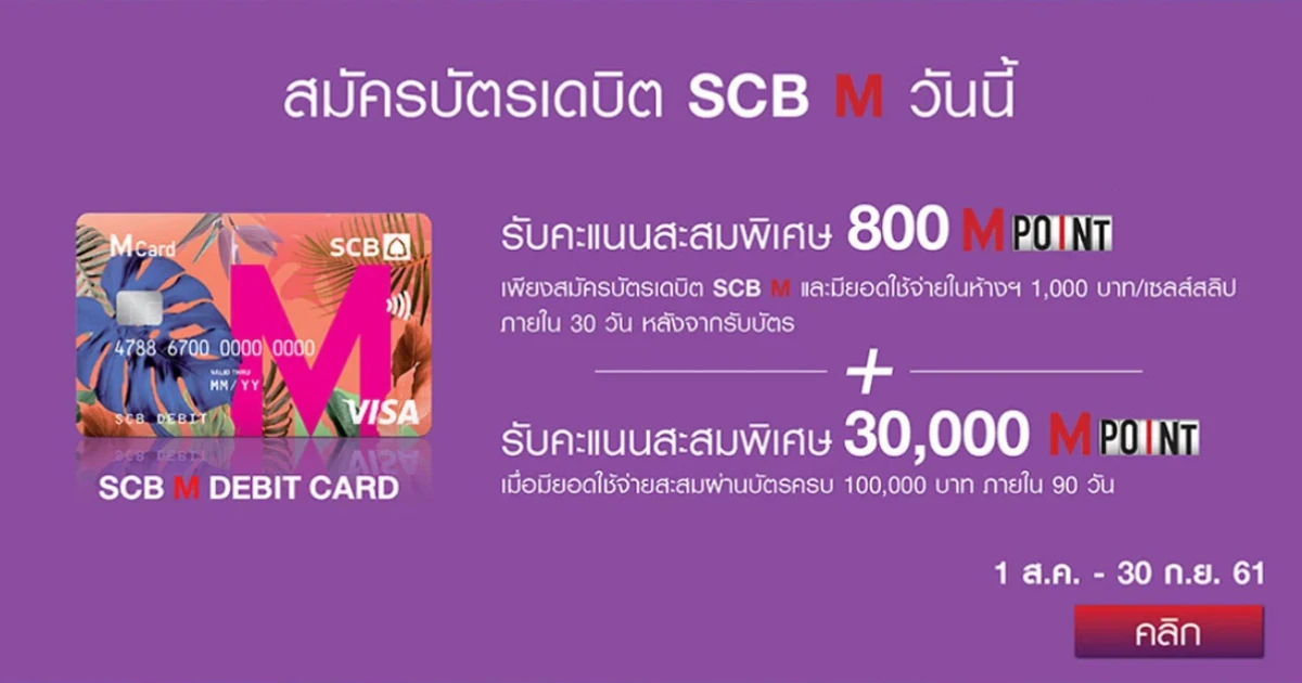 สมัครบัตรเดบิต SCB M วันนี้ รับคะแนนสะสมพิเศษสูงสุด 30,000 M POINT เมื่อมียอดใช้จ่ายสะสมผ่านบัตรครบตามที่ธนาคารฯ กำหนด