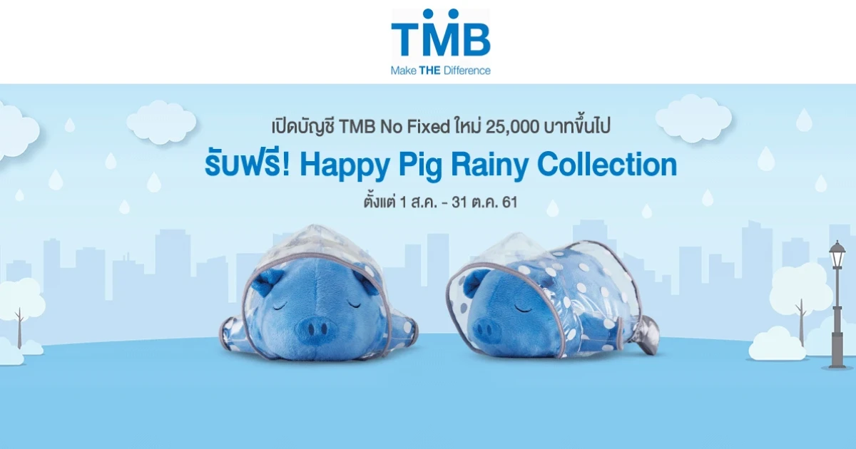 - กรณีเปิดบัญชี ผ่านTMB TOUCH Mobile App สงวนสิทธิ์เฉพาะลูกค้าที่เปิดบัญชีใหม่ 25,000 บาท และค้างเงินไว้ในบัญชีเกิน 1 วัน ธนาคารจะจัดส่ง Happy Pig Rainy Collection ไปยังที่อยู่ที่ท่านเคยให้ไว้กับธนาคาร ภายใน 90 วัน หลังจากจบระยะเวลาโปรโมชั่น วันที่ 31 ต.ค. 61 กรณีของสมนาคุณตีคืนและลูกค้าไม่ติดต่อขอรับของกับธนาคาร ภายใน 180 วันนับจาก 31 ต.ค. 61 ให้ถือว่าลูกค้าสละสิทธิ์ในการขอรับของสมนาคุณ